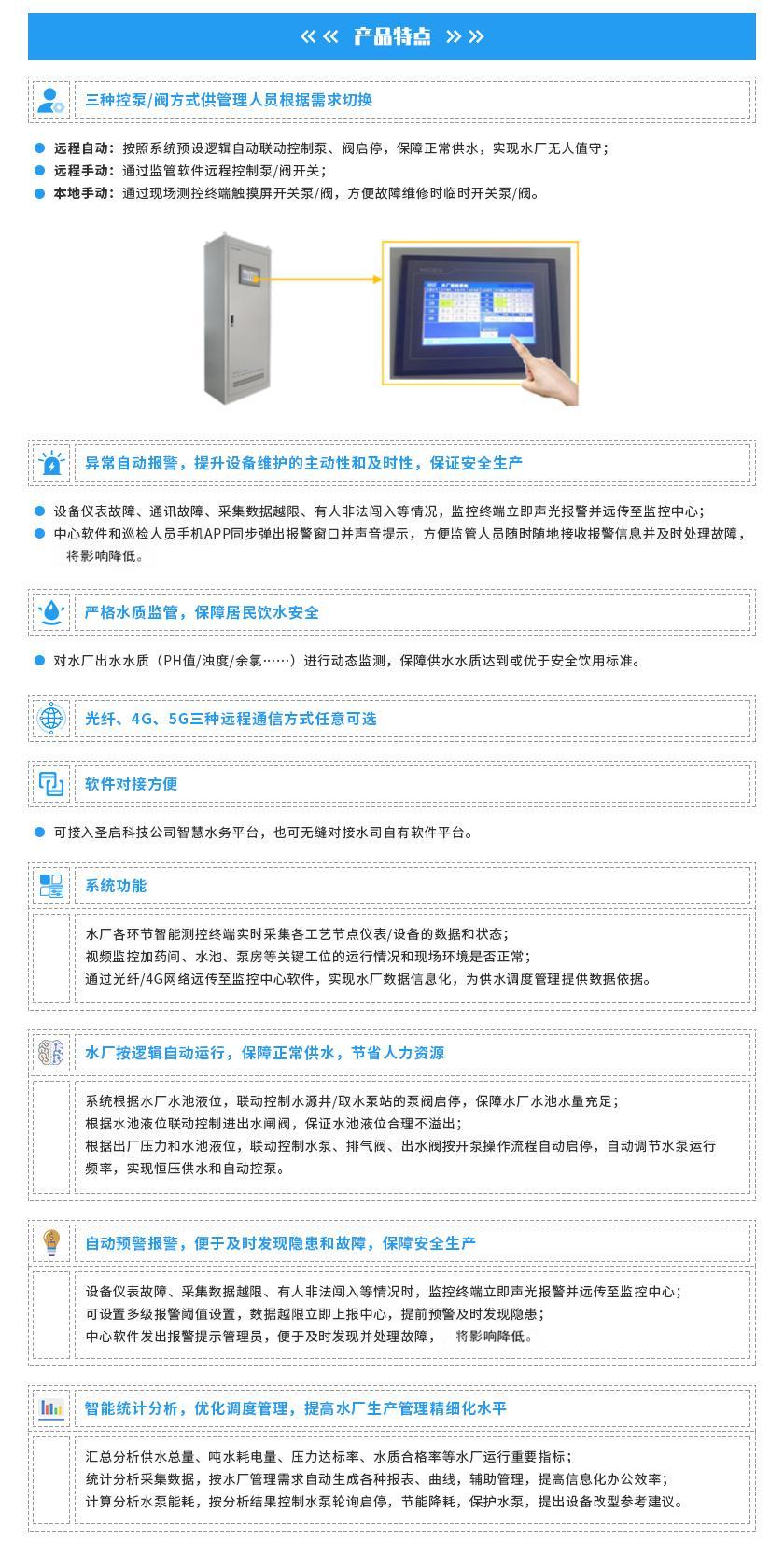 圣启科技根据客户需求提供智慧水厂无人值守信息化系统整体解决方案,包含中心软件、水厂智能测控终端和传感层设备。